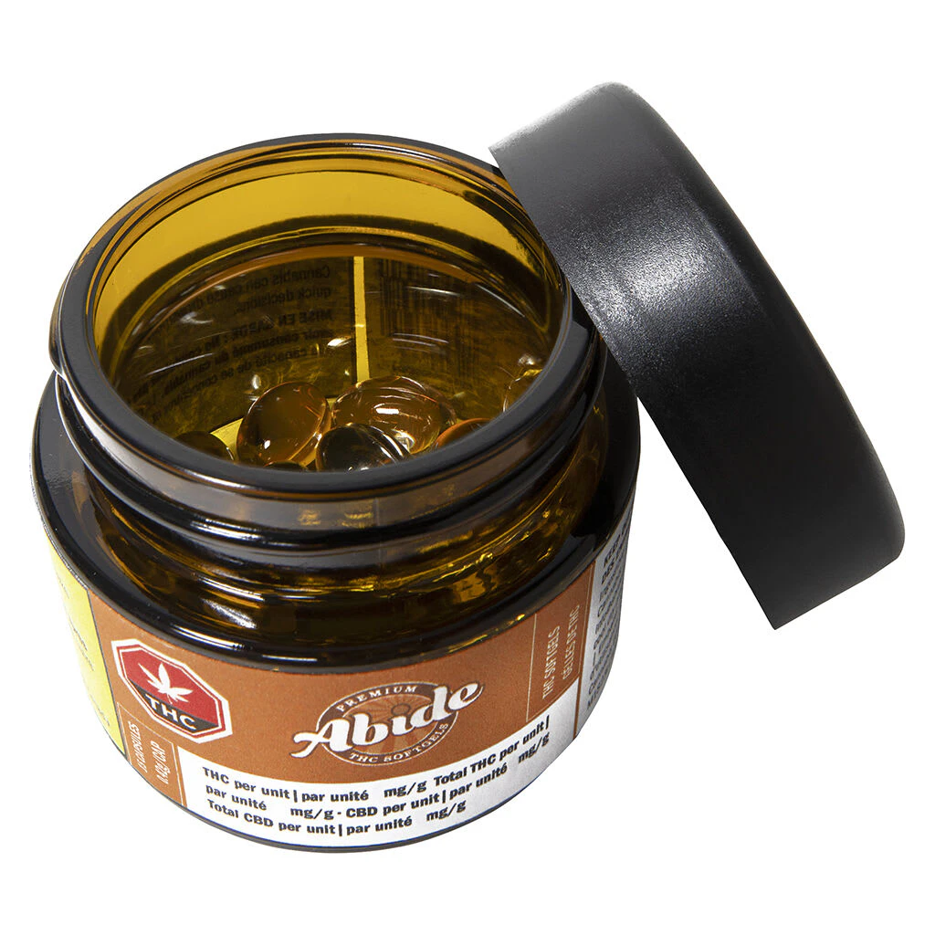 Abide Full Spectrum THC Gelcaps contain 10mg of full-spectrum THC flower infused sunflower oil per gelcap. The full-spectrum THC oil is made by infusing sungrown OG Haze in low heat. 15 gelcaps are packaged in a recyclable amber glass jar.