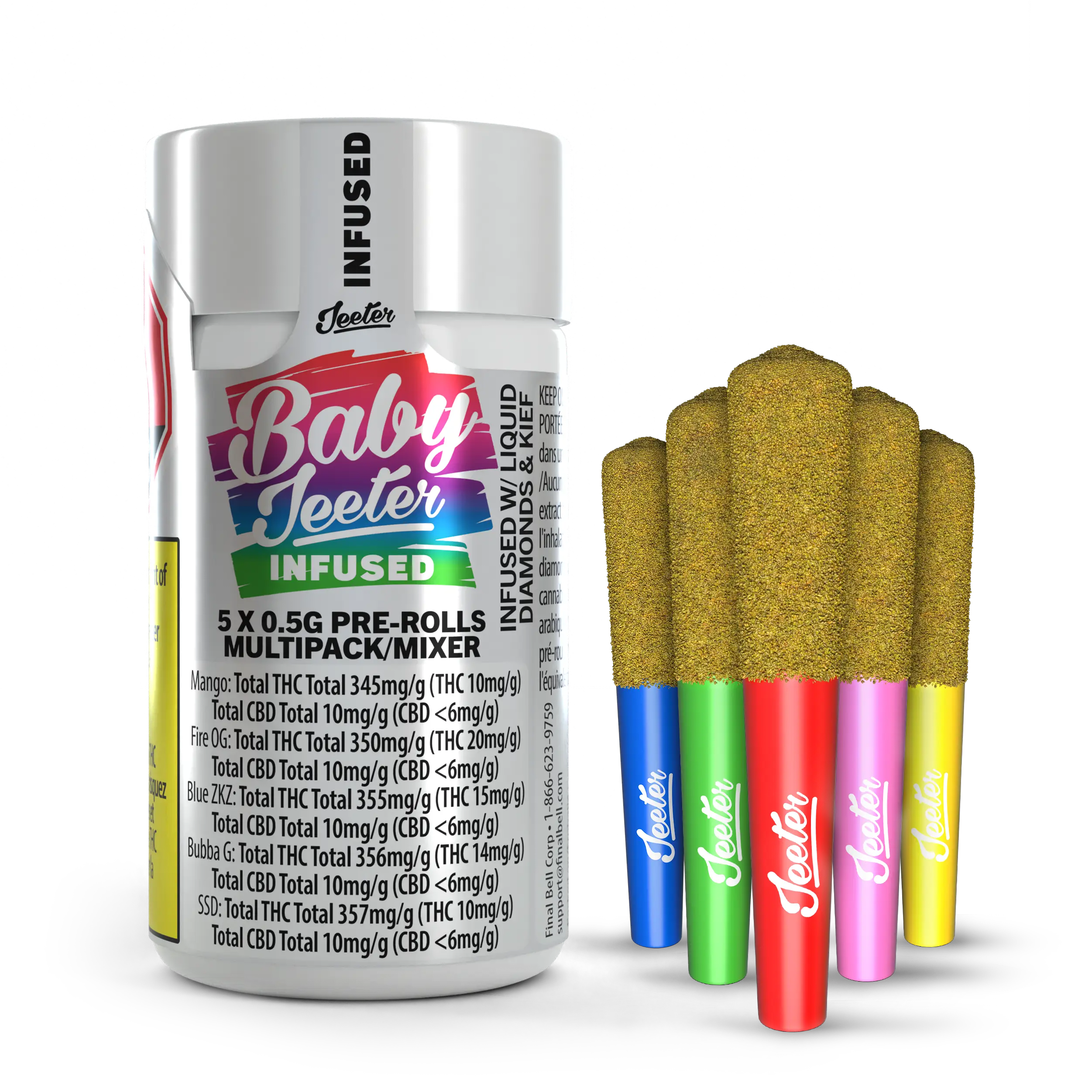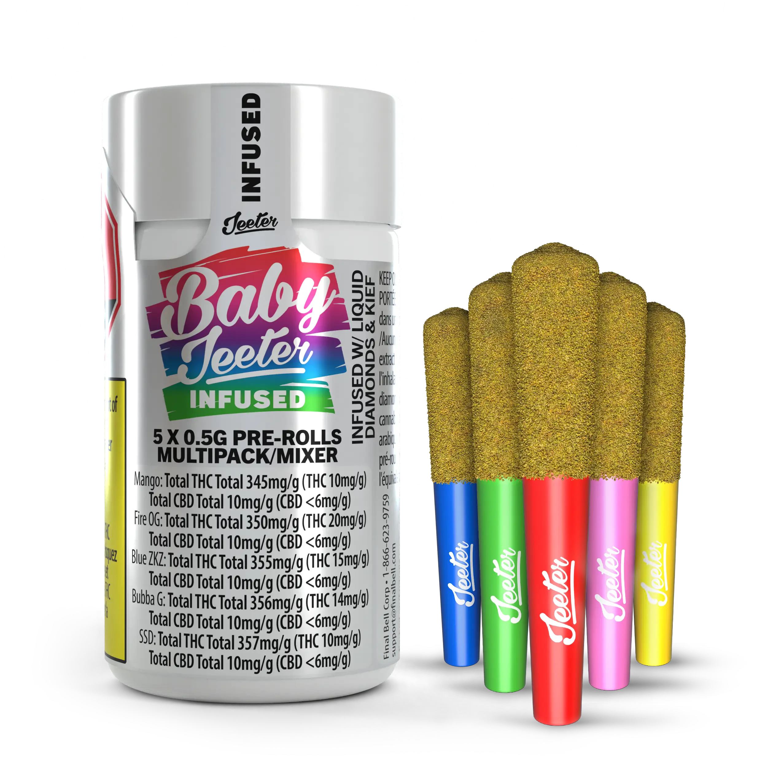 Get ready, Canada! Jeeter is making its grand debut in the Great White North. Baby Jeeters promise an experience that's anything but small. Every meticulously crafted pre-roll is infused with diamonds, crowned with a layer of kief and charged with a burst of unparalleled flavour. Embrace the best, Canada. Jeeter has landed. Experience our first drop of Baby Jeeter flavours in a single multipack. Exclusive to Canada, this assortment brings together Blue ZKZ, Fire OG, Strawberry Sour Diesel, Bubba G and Mango Sherbs for an unparalleled tasting experience.