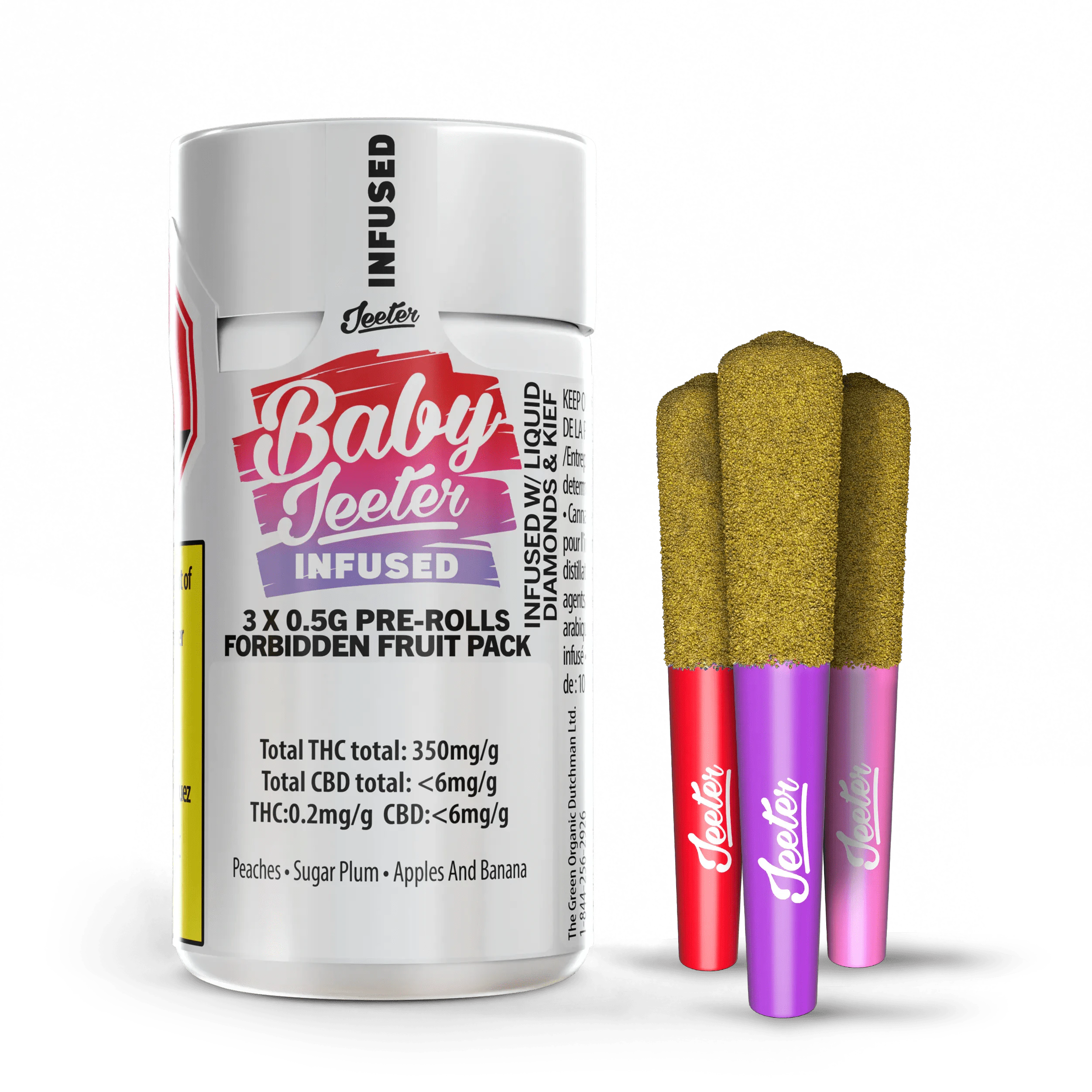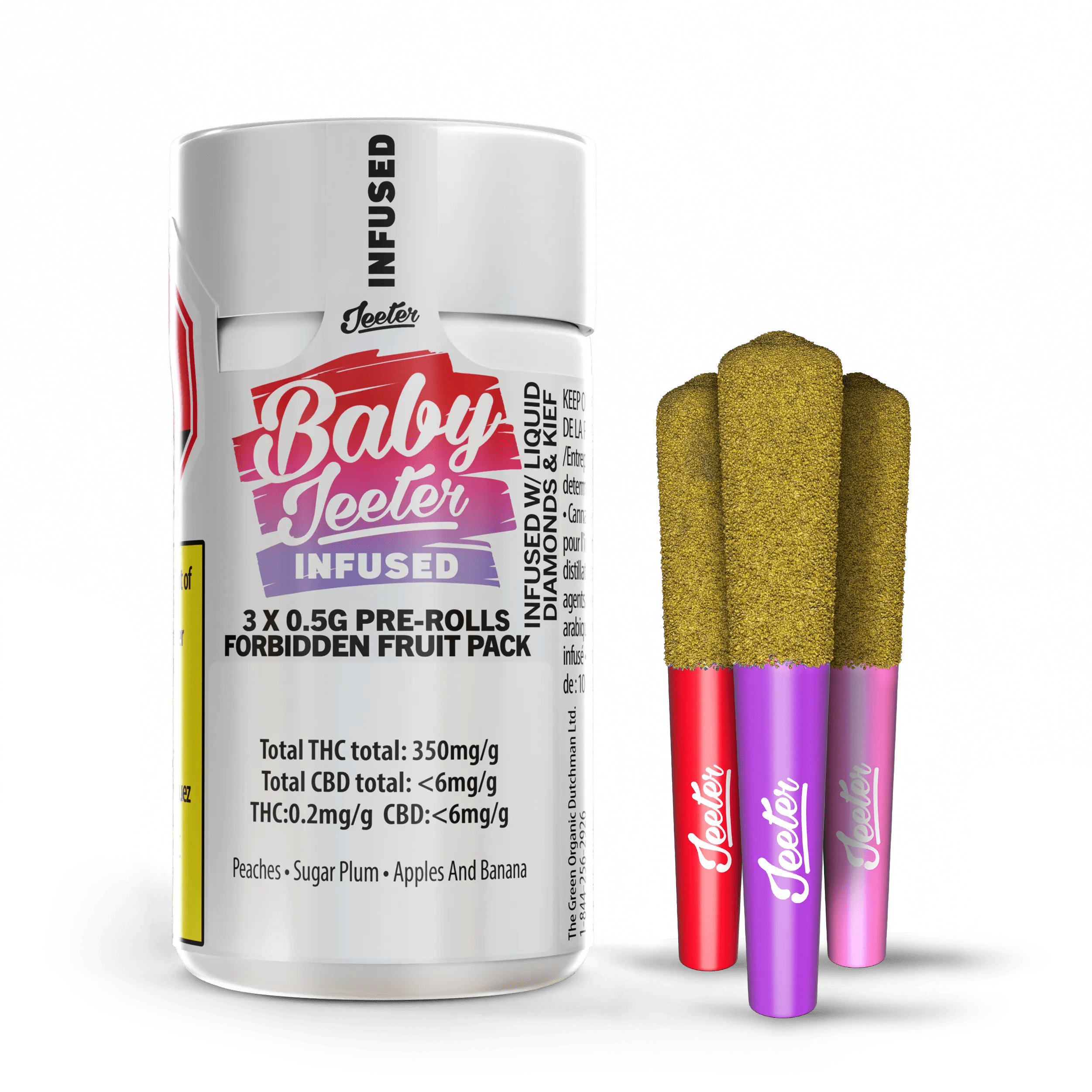 A new multipack of Baby Jeeter flavours exclusively available in Canada. Each pack contains pre-rolls infused with liquid diamonds featuring a curated assortment of Peaches, Sugar Plum and Apples and Bananas. Each strain offers a variety of flavours.