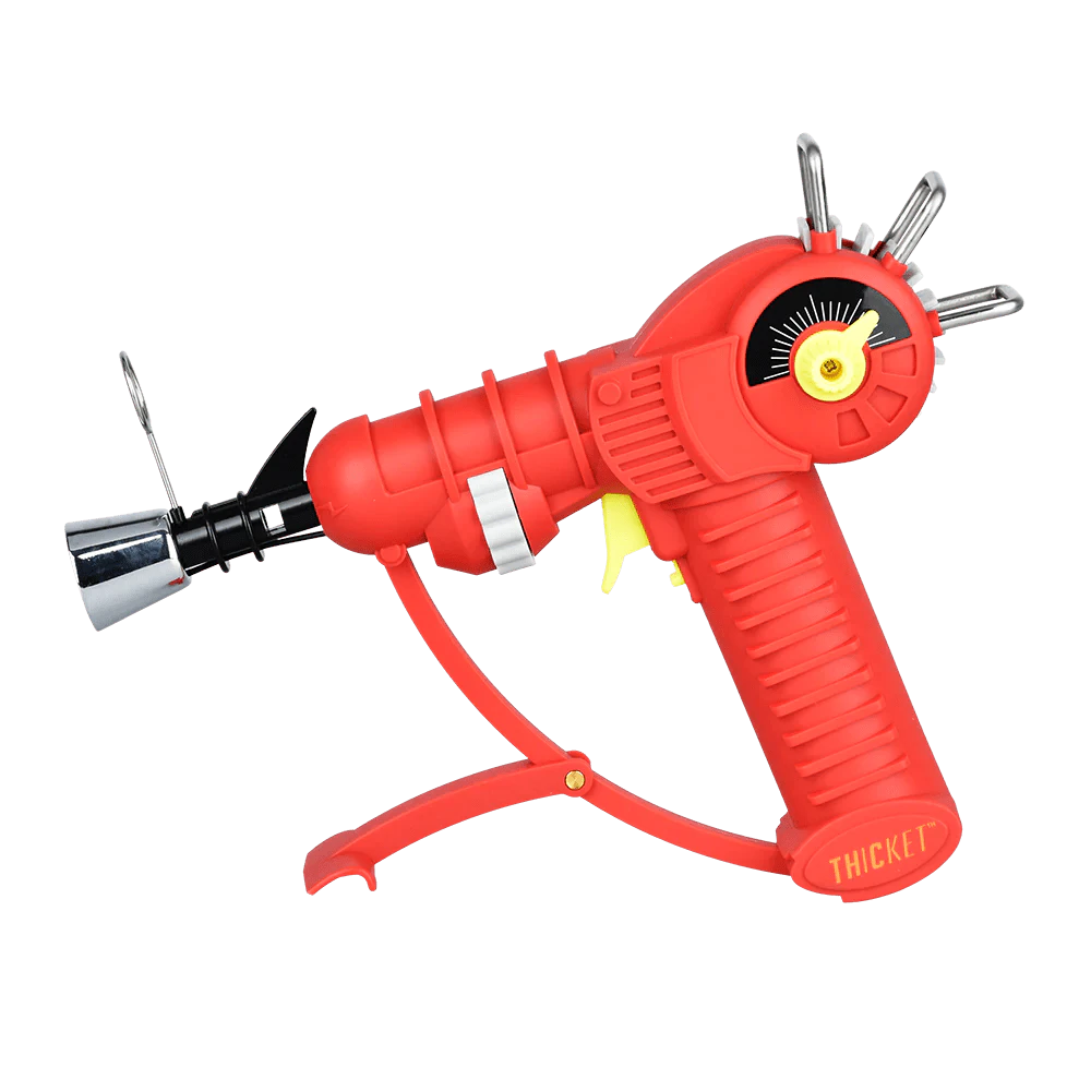 Fire up the Thicket Ray Gun Torch Lighter for an adventure to remember! This dab torch has a truly unique design, shaped like a sci-fi weapon for warding off extraterrestrials complete with stainless steel accents. The single flame is controlled by the flame adjustment dial on the side, while the trigger-style button has a safety lock mechanism. A flip-out kickstand allows this torch to remain upright on flat surfaces for hands-free use or display on a shelf.